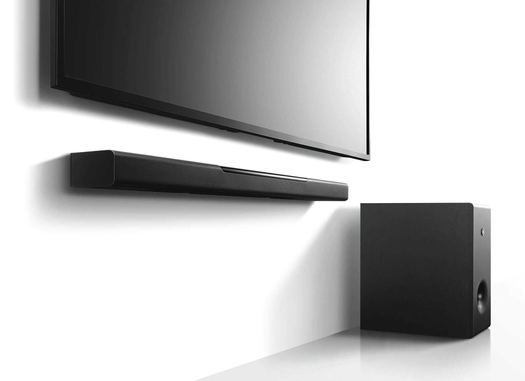 Следующий в рейтинге лучших — весьма мощный саундбар с интересной компоновкой колонок. Производитель не позиционирует систему как решение формата 2.1, вместо этого он разделил звукоизлучающие блоки. В комплект саундбара входит привычная панель и фронтальная колонка. Общая мощность системы составляет 120 Вт, что не может не радовать любителей громкого звука. Поддерживается Dolby Digital, предлагается интерфейс HDMI, а также USB TypeA для флешки. Есть и цифровой оптический вход. Установка режимов и регулировка громкости производится с комплектного пульта ДУ.