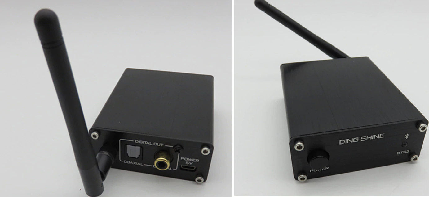 2. Аудиоресивер DIG Shine BTS2 в корпусе на чипе CSR8675 Bluetooth v5.0. Заявлена поддержка 24BIT APTX HD. Для увеличения дальности используется отдельная внешняя антенна. Поддерживает профили: APTX-HD, APTX-LL, APT-X, A2DP, AVRCP, AAC и так далее. Для подключения можно выбрать оптический цифровой выход, коаксиальный цифровой выход.