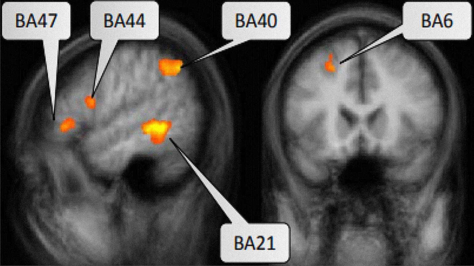 BA44 и BA40 — оперкулярная часть нижней лобной извилины и нижняя теменная доля соответственно