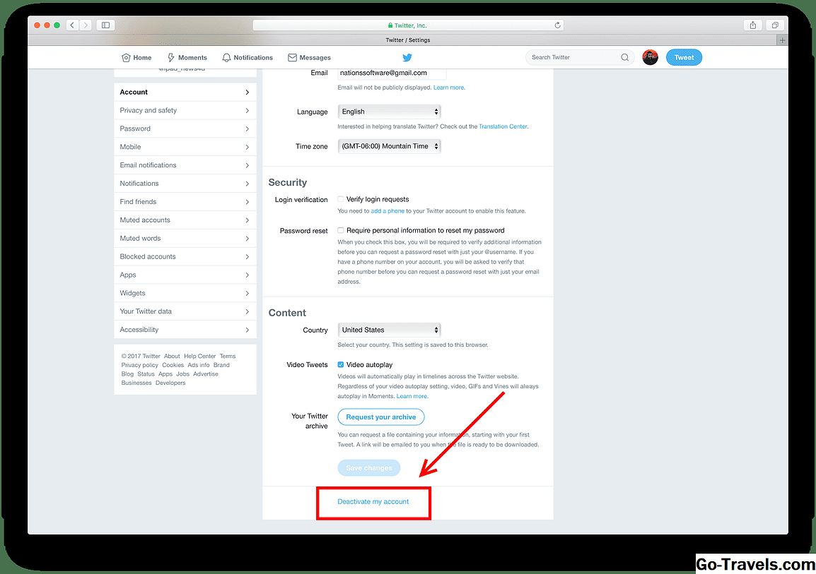 Чтобы полностью отключить свою учетную запись, которая удалит все твиты из Twitter, нажмите Отключить мой счет ссылку чуть ниже кнопки «Сохранить изменения».