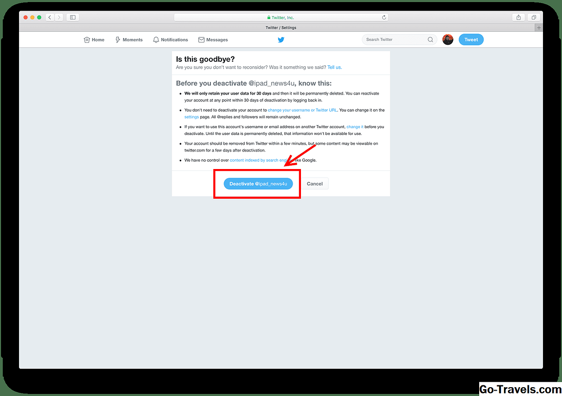 Twitter не хочет, чтобы вы попрощались, поэтому, прежде чем ваша учетная запись будет деактивирована, вы сообщите, что ваши твиты будут сохранены только тридцать дней. В этот момент ваша учетная запись и все записи, сделанные в вашей учетной записи, будут удалены с серверов Twitter постоянно.