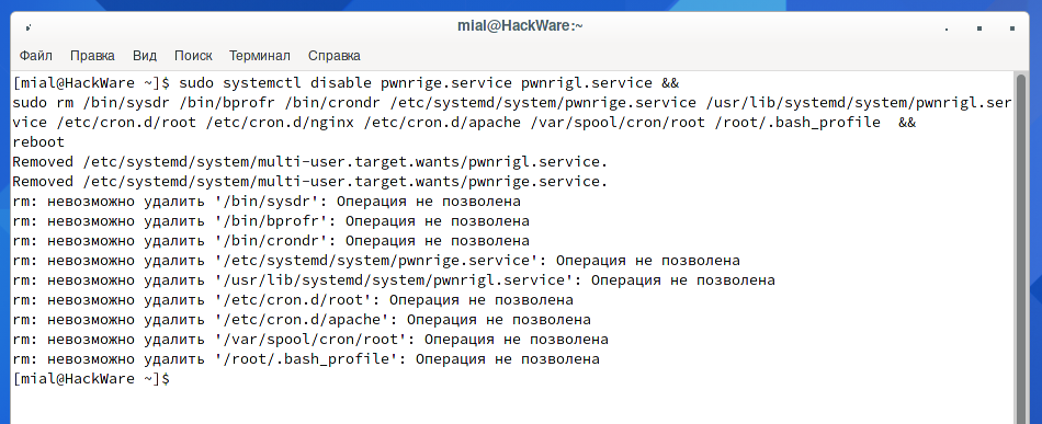 Если процесс вируса ещё активен, то в дополнение к команда очистки, можно завершить процесс вредоносного ПО с помощью kill.
