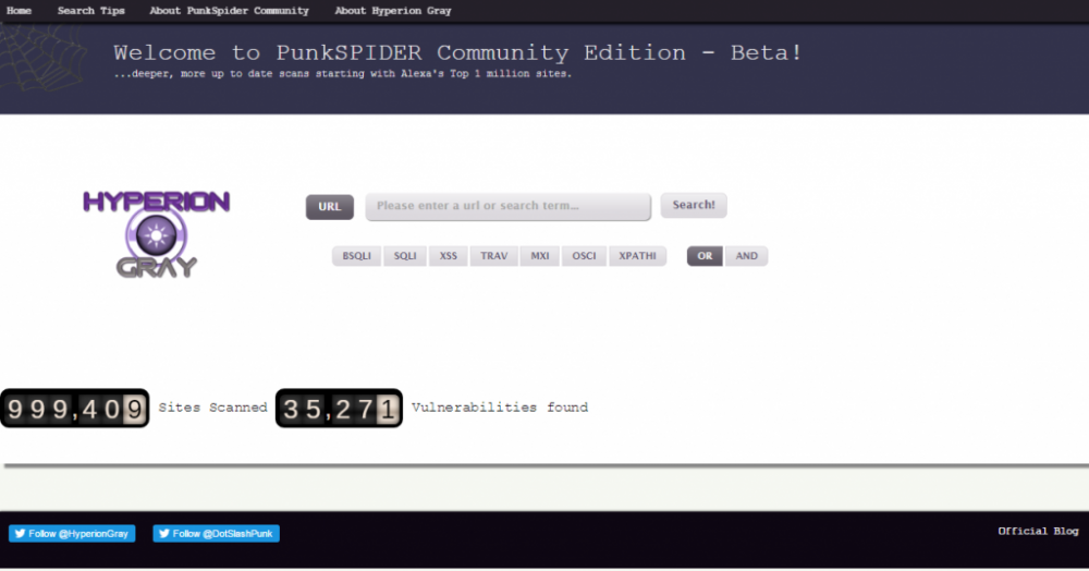 На первый взгляд, PunkSPIDER не выглядит большим и серьезным поисковиком, особенно в сравнении с Shodan. Но их цели похожи. PunkSPIDER является системой для поиска уязвимостей в веб-приложениях. В его основе лежит PunkSCAN, сканер безопасности. PunkSPIDER может искать уязвимости, подверженные следующим типам атак: межсайтовый скриптинг (XSS), слепая SQL-инъекция (BSQLI), Path Traversal (TRAV).