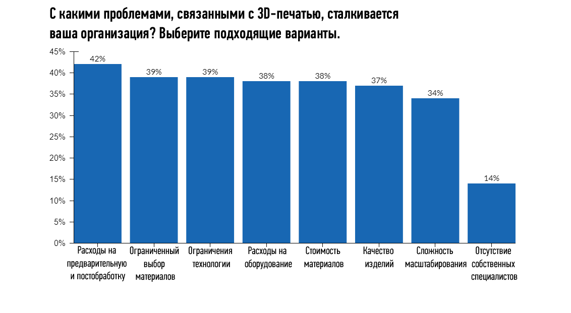 Несмотря на оптимистичный взгляд на развитие аддитивного производства, компаниям еще предстоит решить ряд проблем, связанных с 3D-печатью. В 2019-м половина респондентов рассматривала стоимость материалов как проблему, а в этом году такой ответ дали только около двух пятых. Все проблемы расположились примерно на одном уровне: большинство из них колеблется на отметке 40%.