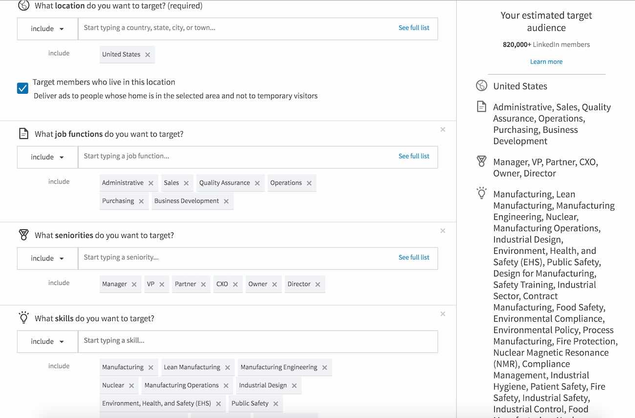 В LinkedIn вы можете запускать таргетинг отдельных лиц и целых компаний. Последняя опция позволяет вести ABM-кампании.