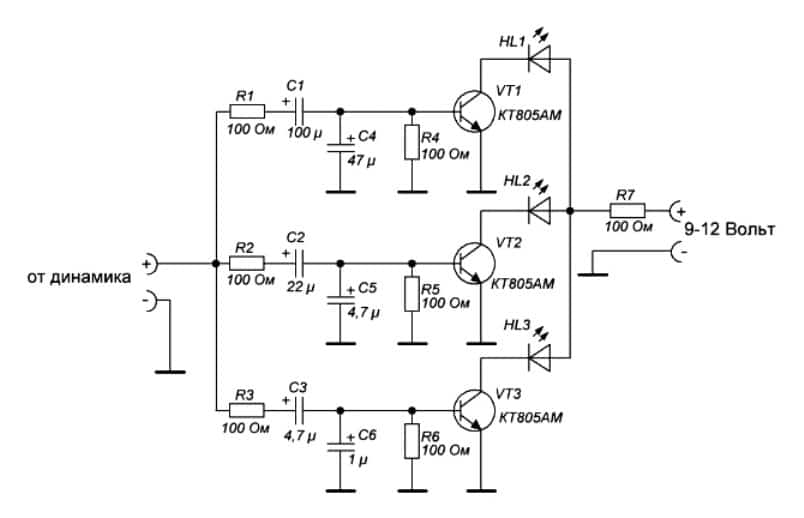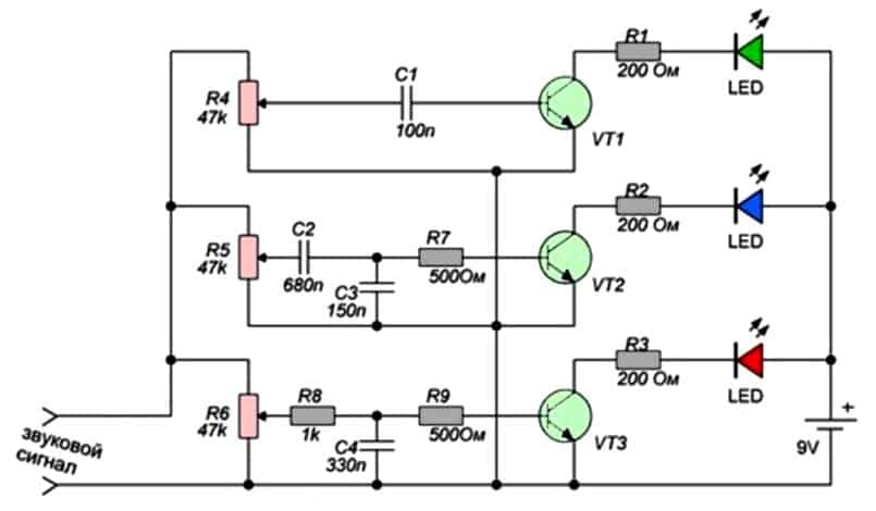 Это схема именно цветомузыки, так как устройство обеспечивает связь частоты звука с цветом светового излучателя. Три канала различаются RC фильтрами, установленными перед транзисторами. В результате нижний канал цветомузыки, к которому подключен красный светодиод, реагирует на звуковые сигналы частотой ниже 300 Гц, средний, с синим светодиодом, работает в диапазоне 300-6000 Гц, а верхний, к которому подключен зеленый светодиод, работает от сигналов выше 6000 Гц. Звуковой сигнал, как и в прошлом варианте, подается с выхода для наушников, колонок или динамиков авто.