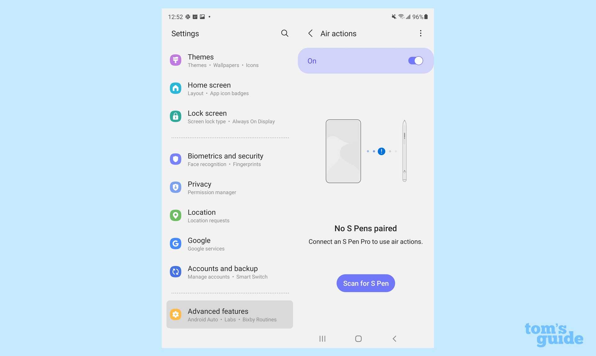 Во всяком случае, так обстоят дела с S Pen Fold Edition — это более дешевый аксессуар, доступный владельцам Galaxy Z Fold 3. Планшет также поддерживает S Pen Pro, стилус с поддержкой Bluetooth. Подключите S Pen Pro к Galaxy Z Fold 3 в меню настроек Bluetooth; Затем вы можете настроить Air Actions в меню S Pen в приложении «Настройки». (Как известно владельцам Galaxy Note, Air Actions превращает S Pen Pro в пульт дистанционного управления, где вы можете разбудить телефон, получить доступ к главному экрану и выполнить другие действия, просто взмахнув стилусом в воздухе.)