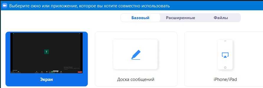 Прямо в режиме конференции через опцию «Демонстрация экрана» можно выбрать, чем участники будут совместно пользоваться – экран, доску для заметок или приложение.