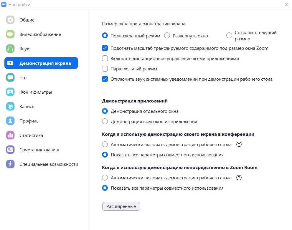Базовые настройки экрана Зум в декстопной версии программы находятся в меню «Демонстрация экрана». Там можно:
