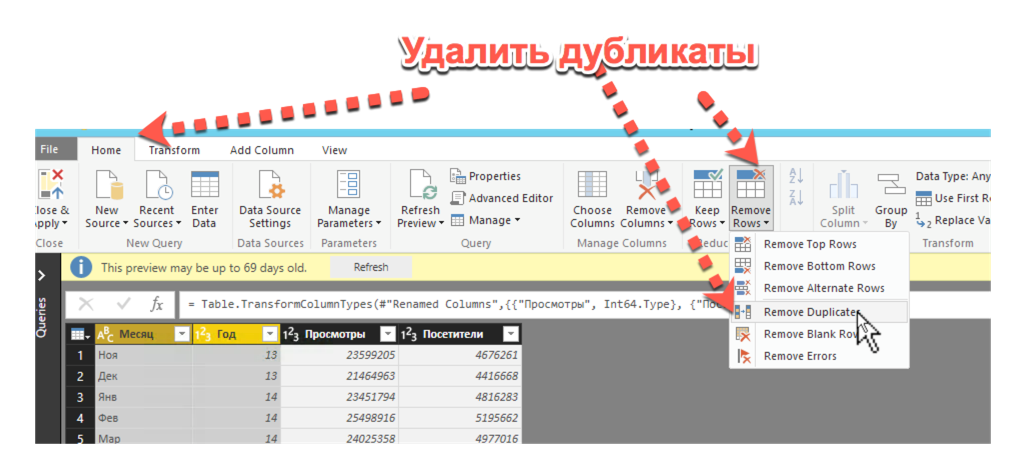 Команда «Remove Duplicates» проходит по выбранным столбцам (если выбрана вся таблица, то по всей таблице) и смотрит в них повторяющиеся ячейки (строчки, в случае если выбрана таблица). Если дубликаты найдены функция оставляет первую попавшуюся уникальную строчку и удаляет все последующие повторяющиеся Найти команду можно на Ribbon — Home — Remove Duplicates (Удалить дубликаты в выбранных столбцах)