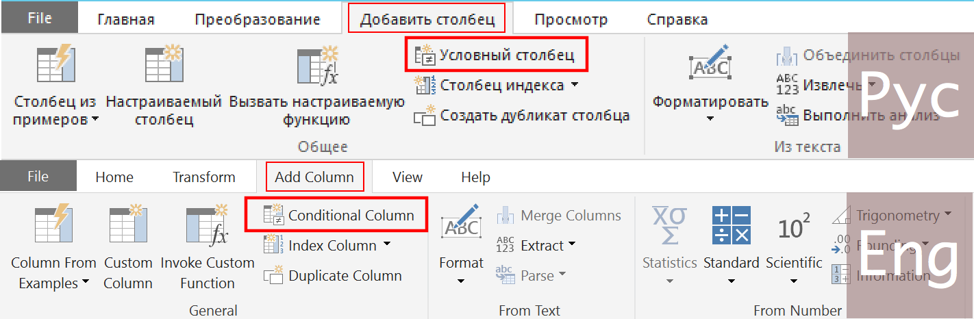 Мастер добавления столбца с условным значением (условного столбца), формирует значение столбца согласно заданным правилам. Мастер добавления условного столбца можно найти в Power Query, на вкладке добавления столбца, как показано на скриншоте ниже.