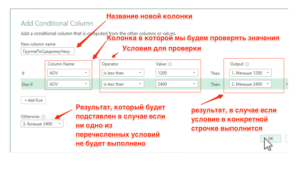 Пояснения к мастеру конфигурации условного столбца показаны на скриншоте ниже.