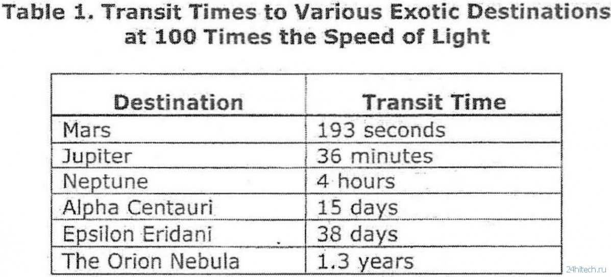 В этом же документе приводится инфографика, объясняющая, насколько быстрыми смогут стать космические путешествия, если человечество сможет передвигаться в космосе со скоростью, в сотню раз превосходящей скорость света