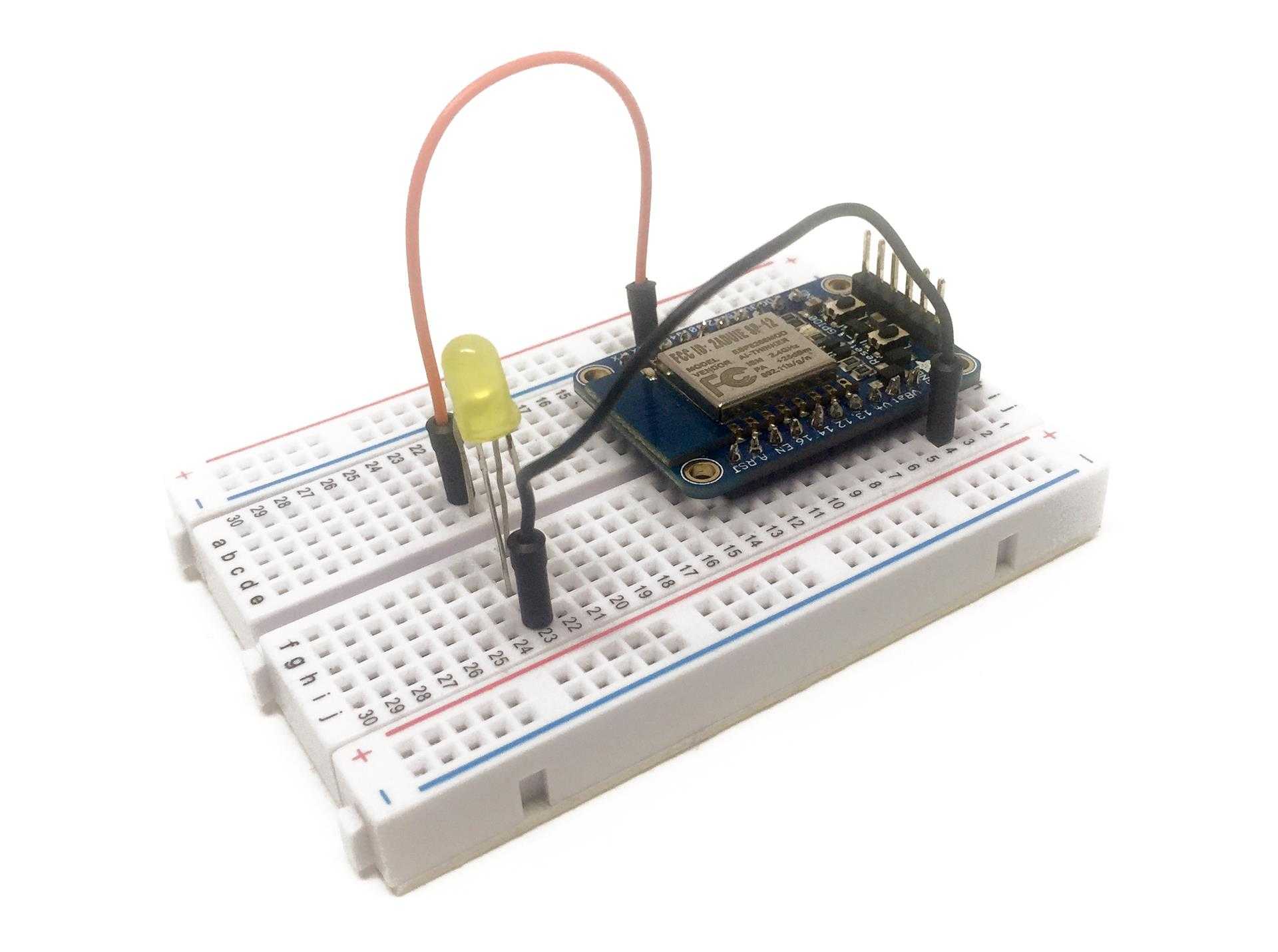 Схема достаточно простая: сначала установите ESP8266 на breadboard. После этого установите светодиод. Не забывайте, что длинная (позитивная) нога светодиода подключается через резистор. Вторая нога резистора подключается к контакту 5 на модуле ESP8266. Вторая (катод) светодиода подключаем к пину GND на ESP8266.