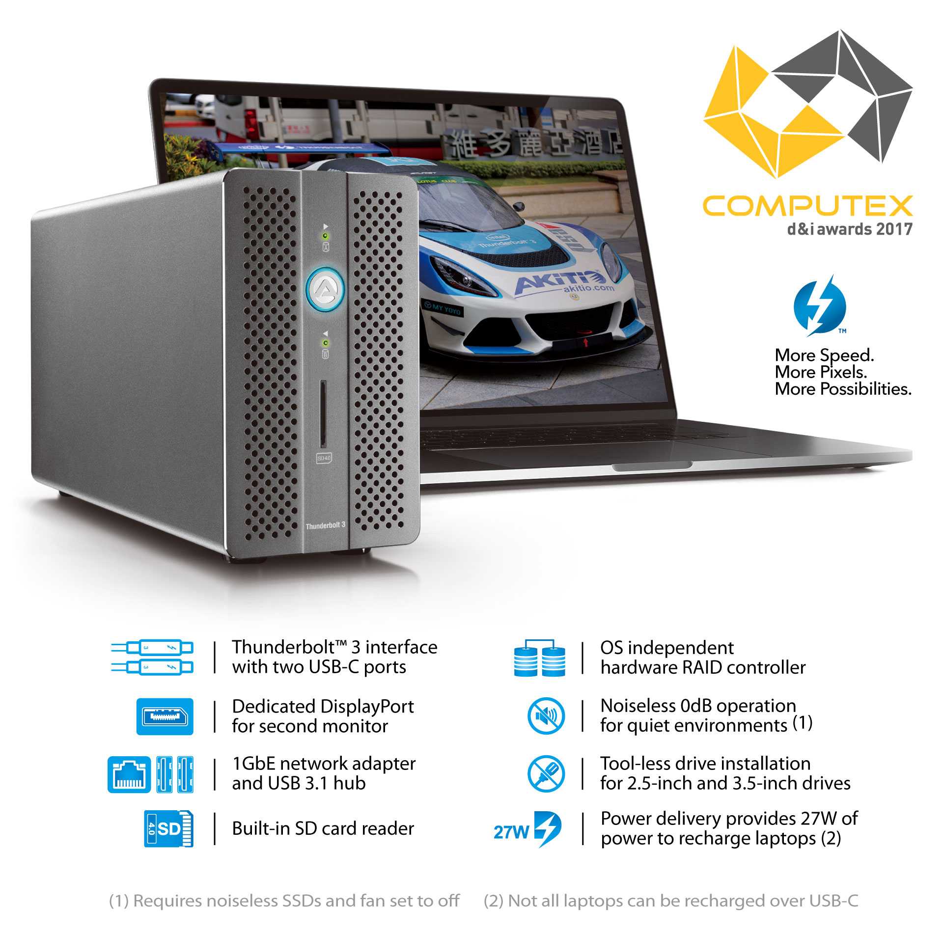 Expand the capabilities of your laptop and declutter your workspace with the Thunder3 RAID Station. This solution combines four essential functions every laptop user needs into one product, giving you additional storage space, providing you with important interfaces such as Gigabit Ethernet, USB and DisplayPort, recharging your battery and reading your SD cards. All this is built into a single product that connects to your laptop with a single Thunderbolt 3 cable.