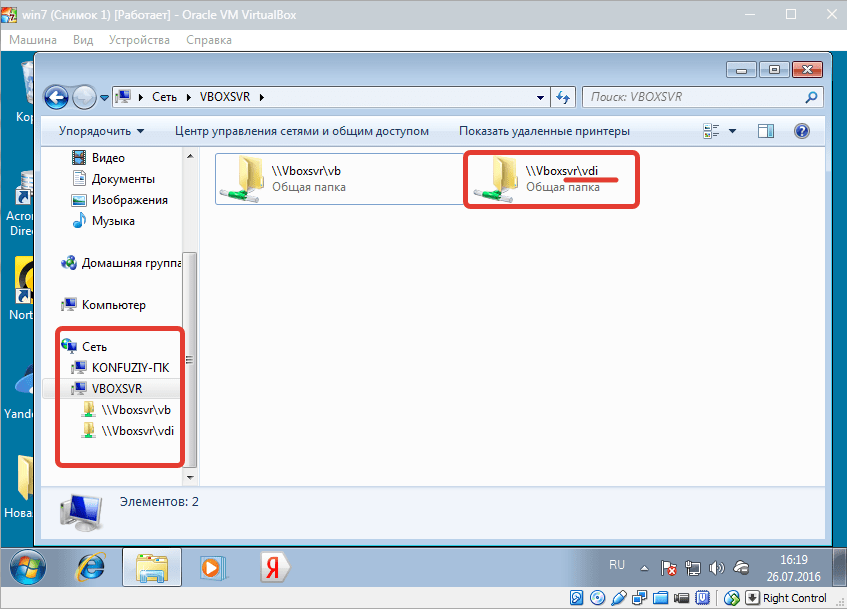 Созданная общая папка немедленно станет видна в разделе «Сетевые подключения» Проводника. Для этого в данном разделе нужно выбрать «Сеть», далее VBOXSVR. В проводнике можно не только увидеть папку, но и совершать с ней действия.