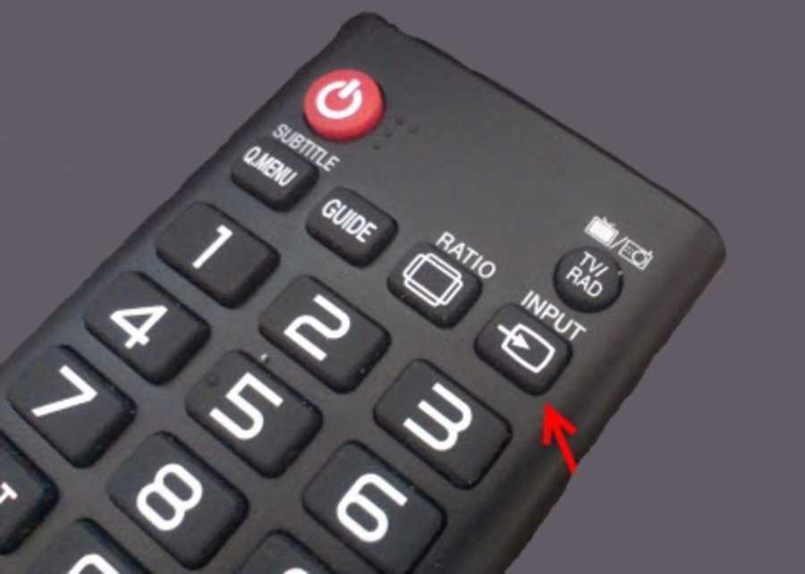 Для того, чтобы телевизор принимал видеосигнал — нажмите на пульте дистанционного управления кнопку Input.