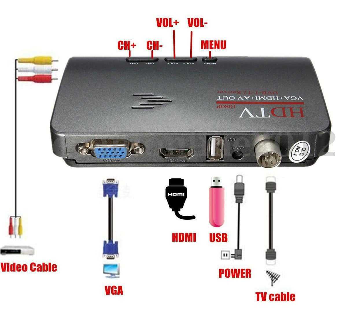 В комплектацию тюнера входит пульт, инструкция на английском, блок питания. На задней стороне приставки расположены базовые разъемы для подсоединения устройства: VGA, RCA, USB, коннектор питания и гнездо для антенны.