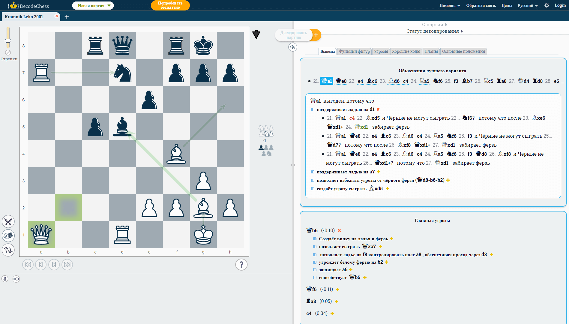 Анализ позиции можно проводить прямо во время игры. Для каждой позиции DecodeChess показывает несколько областей, представляющих интерес при шахматном анализе: угрозы противника и то, что от них остается если сделать наилучший ход, показывает лучшие ходы в порядке убывания, раскрывает важные позиционные и тактические мотивы.