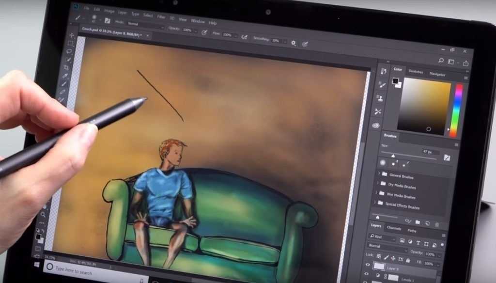 Аппарат показывает отличные характеристики яркости и контрастности. Такой экран прекрасно подойдет для работы с изображениями. У девайса хорошие углы обзора, поэтому при наклоне экрана даже на 180 градусов цвета остаются сочными и неискаженными. Сам дисплей у планшета глянцевый, но благодаря показателям яркости на нем можно комфортно работать даже при солнечном свете. Сенсорный экран поддерживает до 10 одновременных касаний и быстро реагирует на действия пользователя.