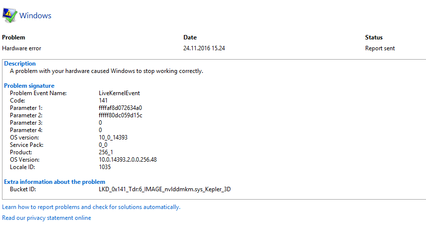 Source Windows Summary Hardware error Date 11/1/2018 10:11 AM Status Not reported Description A problem with your hardware caused Windows to stop working correctly. Problem signature Problem Event Name: LiveKernelEvent Code: 144 Parameter 1: 3003 Parameter 2: ffffad8c0b1a75c8 Parameter 3: 40010002 Parameter 4: 0 OS version: 10_0_17134 Service Pack: 0_0 Product: 256_1 OS Version: 10.0.17134.2.0.0.256.48 Locale ID: 1033