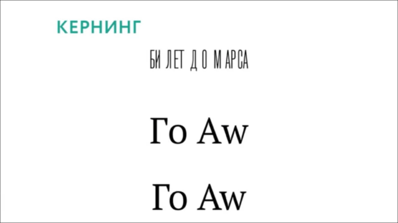Кернинг — регулирование межбуквенного расстояния для каждой отдельной буквенной пары. Например, в сочетаниях букв AW или Го расстояние между буквами может быть нулевым или даже минусовым, потому что одна буква идеально сочетается с другой, как две части пазла. Без кернинга в некоторых комбинациях букв будут огромные непропорциональные апроши — межбуквенные пробелы.