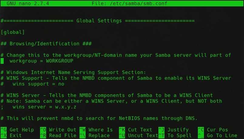 Файл будет выглядеть пугающим, когда вы впервые откроете его. Не беспокойся Вам не нужно трогать большую часть этого. Единственное, что вам нужно изменить в основной конфигурации — это рабочая группа. Найдите строку ниже и установите ее равной вашей фактической группе ворга Windows.