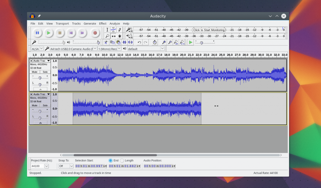 Audacity позволяет вырезать фрагменты аудиофайлов для экспорта в файл требуемого формата. Для точного выбора начала и конца участка используйте инструменты масштабирования либо «Начало и конец выделения» в строке состояния. Изменять масштаб можно при помощи колёсика мыши с зажатым Ctrl.