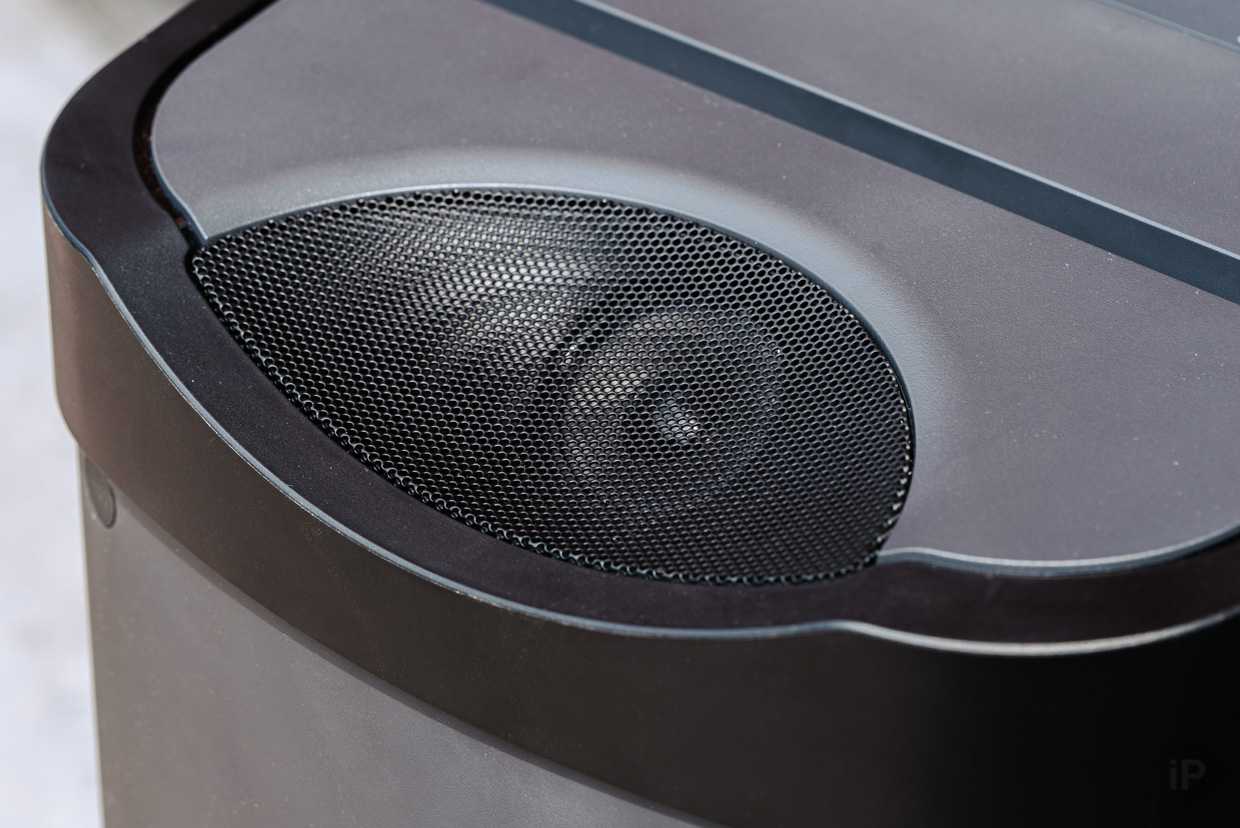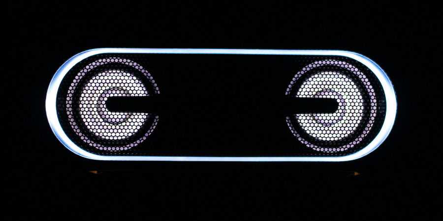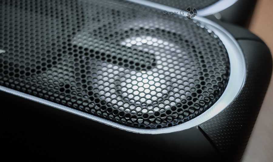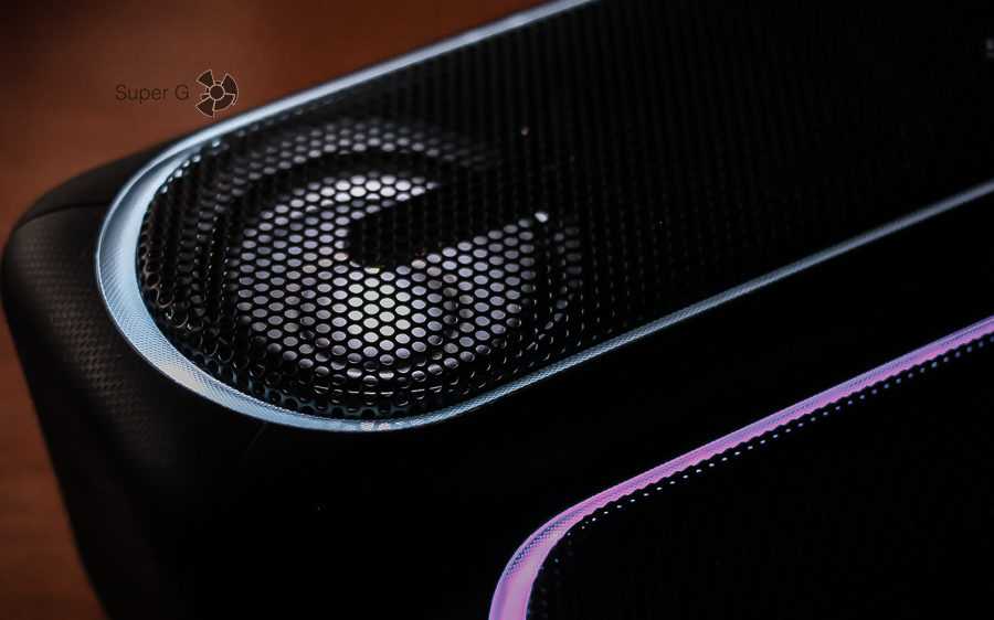 Передняя сторона прикрыта металлической сеткой, которая защищает два динамика и пассивный излучатель. По периметру этой сетки, с внешней стороны, находится один из элементов подсветки.