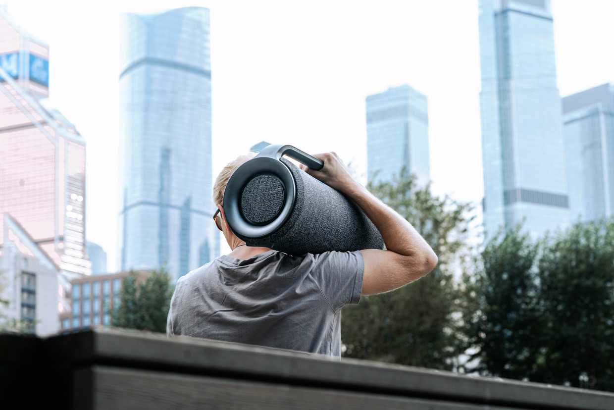 Весит тоже немало, целых 5,6 кг. Долго такую, скажу по опыту, не поносишь. Да и это ни к чему, такое устройство достаточно перетащить из пункта А в Б и наслаждаться музыкой. Для повышения портативности производитель предусмотрел удобную ручку для переноски. Она комфортно лежит в руке и не режет ладонь, пока вы транспортируете колонку.