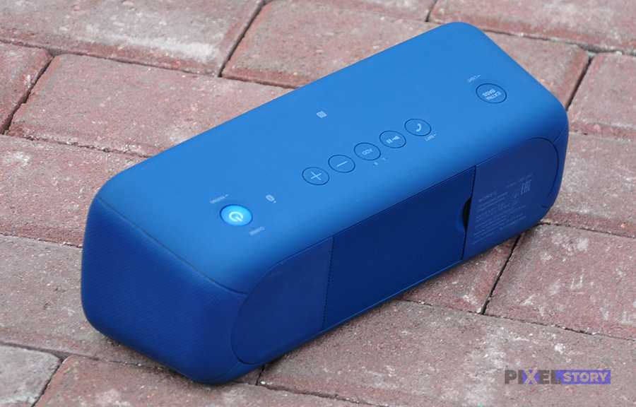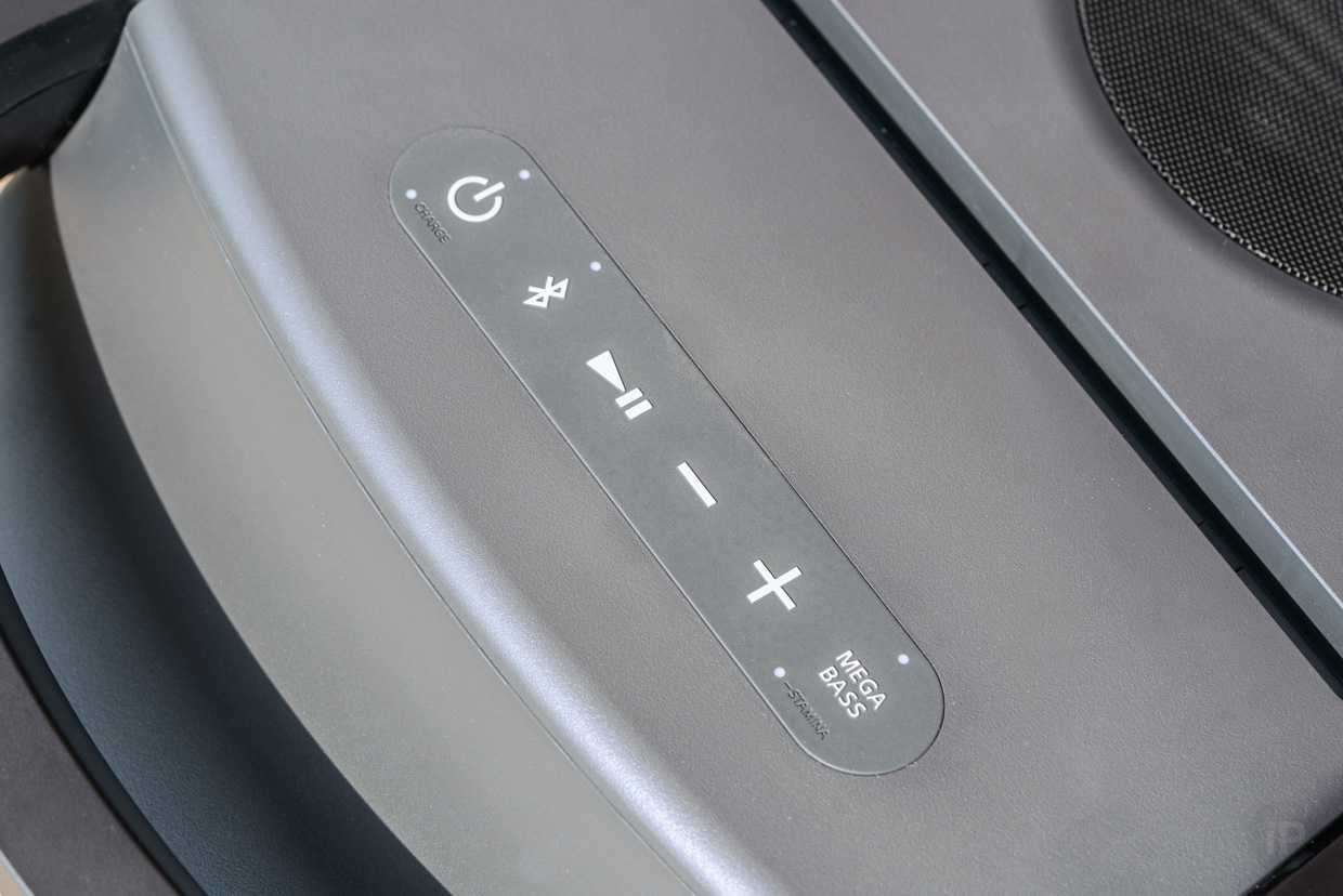 Кнопки управления звуком, перемотки, системы Extra Bass (она же является кнопкой включения и отключения диодной полоски) и включения также находятся под резиновой оболочкой и расположены на верхней части. Они туго нажимаются, издавая ощутимый щелчок.