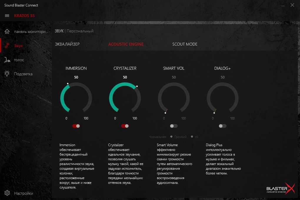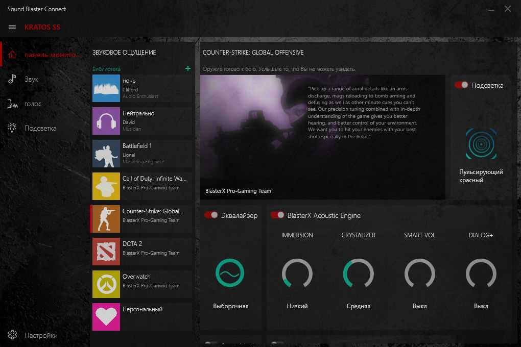 Чтобы изменить настройки звуковых режимов на компьютер потребуется установить программу Sound Blaster Connect и перейти в раздел BlasterX Acoustic Engine Pro. Кроме того, в программе есть уже готовые пресеты для видеоигр (Call of Duty: Infinite Warfare, Battlefield 1, DOTA 2, Overwatch и CS:GO), ответственные за создание максимально реалистичного звучания на виртуальном полигоне выбранной игры. В случае чего — пресеты можно индивидуально подстроить под себя или создать новые.