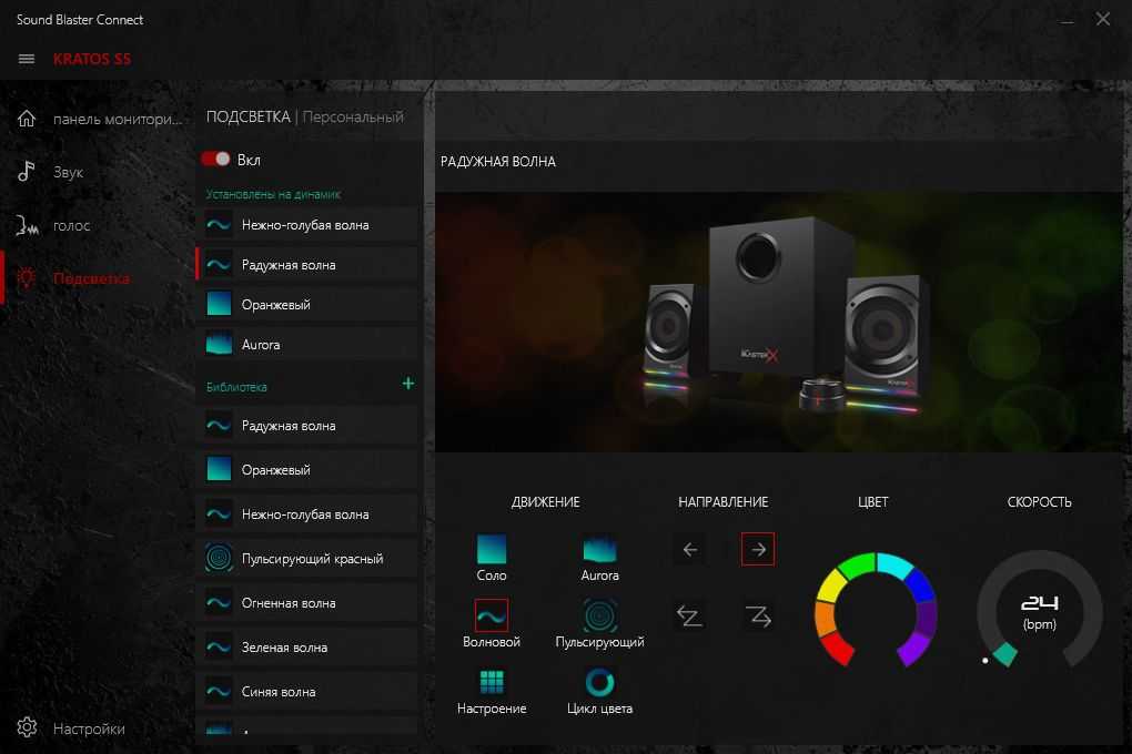 Управление подсветкой тоже осуществляется через Sound Blaster Connect, позволяя выбирать тип свечения (пульсация, переливание, дыхание или статичное состояние), скорость смены оттенков на LED-панели сателлитов, цвет и направление течения светового потока (слева направо или справа налево).