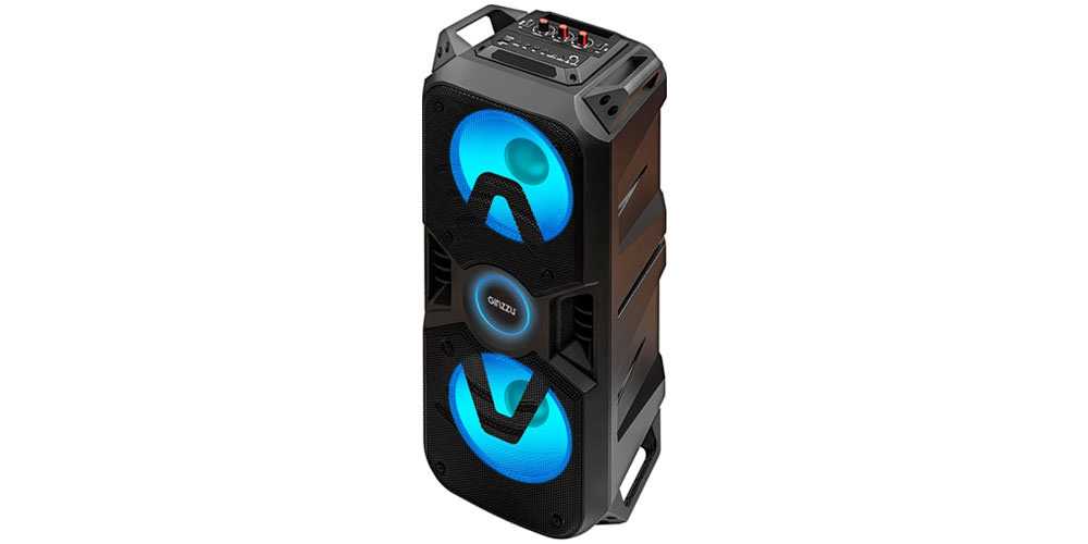 Открывает рейтинг бюджетная музыкальная переносная система с Bluetooth, караоке, FM-радио, аудиоплеером, эквалайзером для популярных настроек, с эффектной динамической подсветкой. Цена — 3990 рублей.