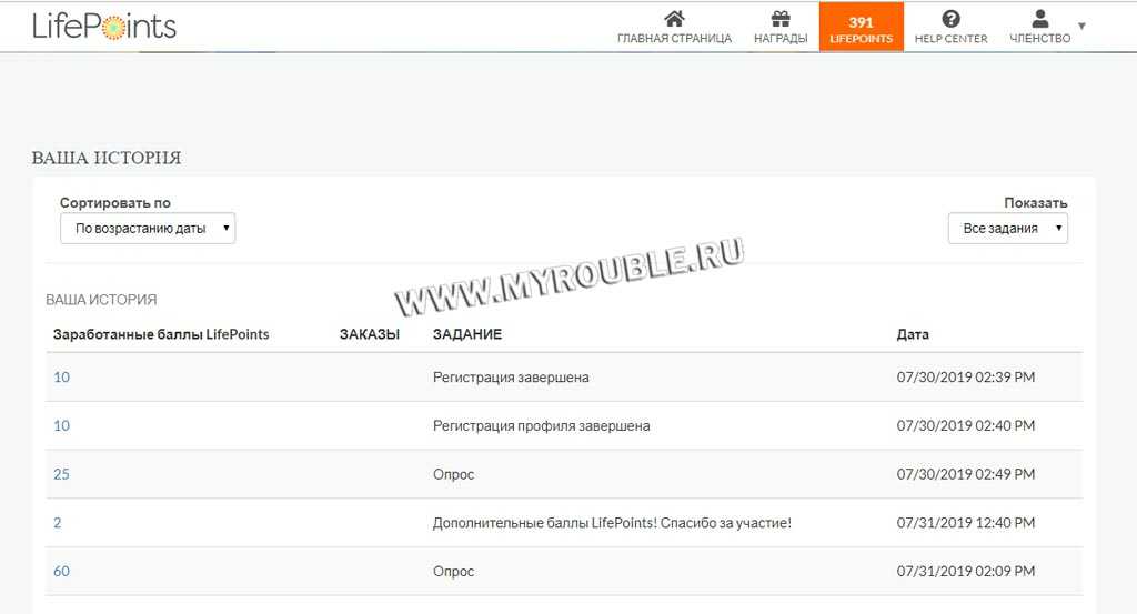 Мое задание, как и кнопка баланса, показывает нам историю пройденных опросов и проведенных операций.
