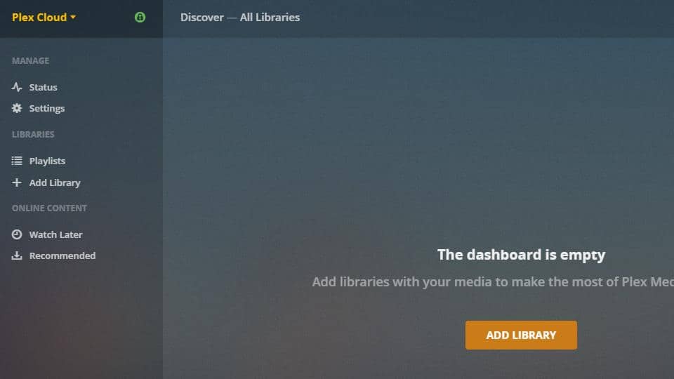 Теперь вам нужно добавить свои медиа-папки, такие как фильмы и музыка, в библиотеку Plex. Для этого нажмите кнопку «Добавить библиотеку».
