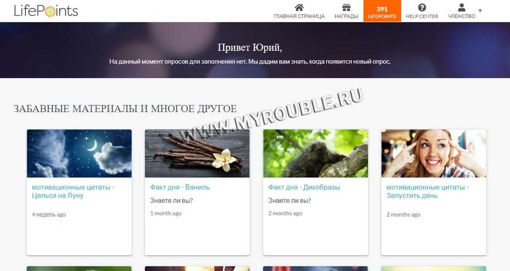 После входа в аккаунт вы попадаете на главную страницу, где можете увидеть количество заработанных очков и доступные опросы. Опустившись ниже, вы увидите множество различных статей, которые добавляют просто «для почитать».