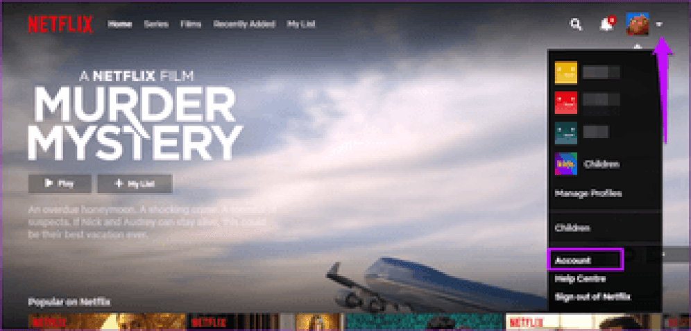 Шаг 1: Сначала откройте Netflix в браузере своего ПК, щелкните свой профиль и нажмите кнопку «Учетная запись».