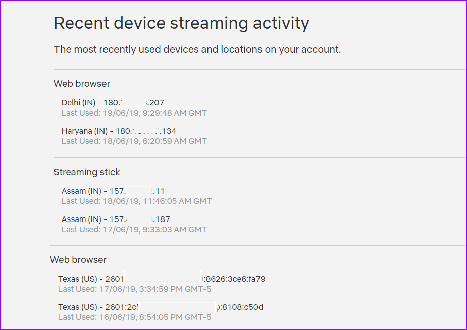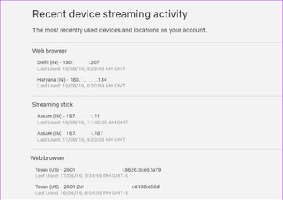 Чтобы проверить подключенные устройства в вашей учетной записи Netflix, вы можете перекрестно проверить заголовки из своей истории просмотров. Кроме того, вы можете напрямую проверить IP-адреса пользователей, а затем удалить неавторизованные.