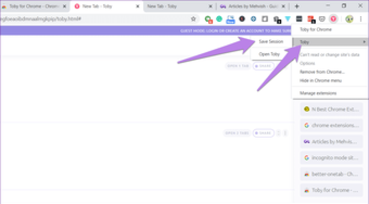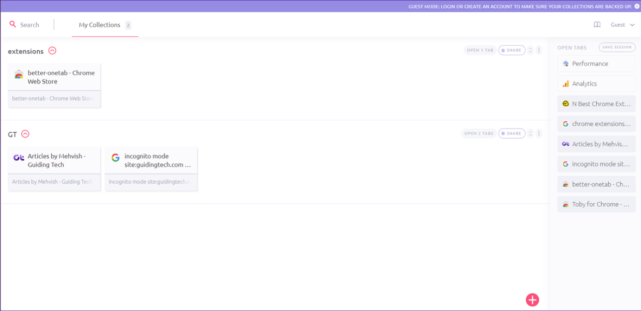 Еще одно замечательное расширение, которое я люблю, — Тоби. Он упорядочивает ваши сохраненные вкладки в коллекциях, которые в основном являются папками. Вы можете сохранить весь сеанс с помощью значка расширения или открыть Тоби, чтобы перетащить открытые вкладки в коллекции.