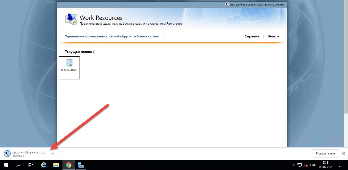 Далее вы переходите в веб интерфейс RDWEb и авторизуетесь, у вас будет доступно приложение калькулятор. Щелкните по нему и у вас будет запущено скачивание RDP пакета.