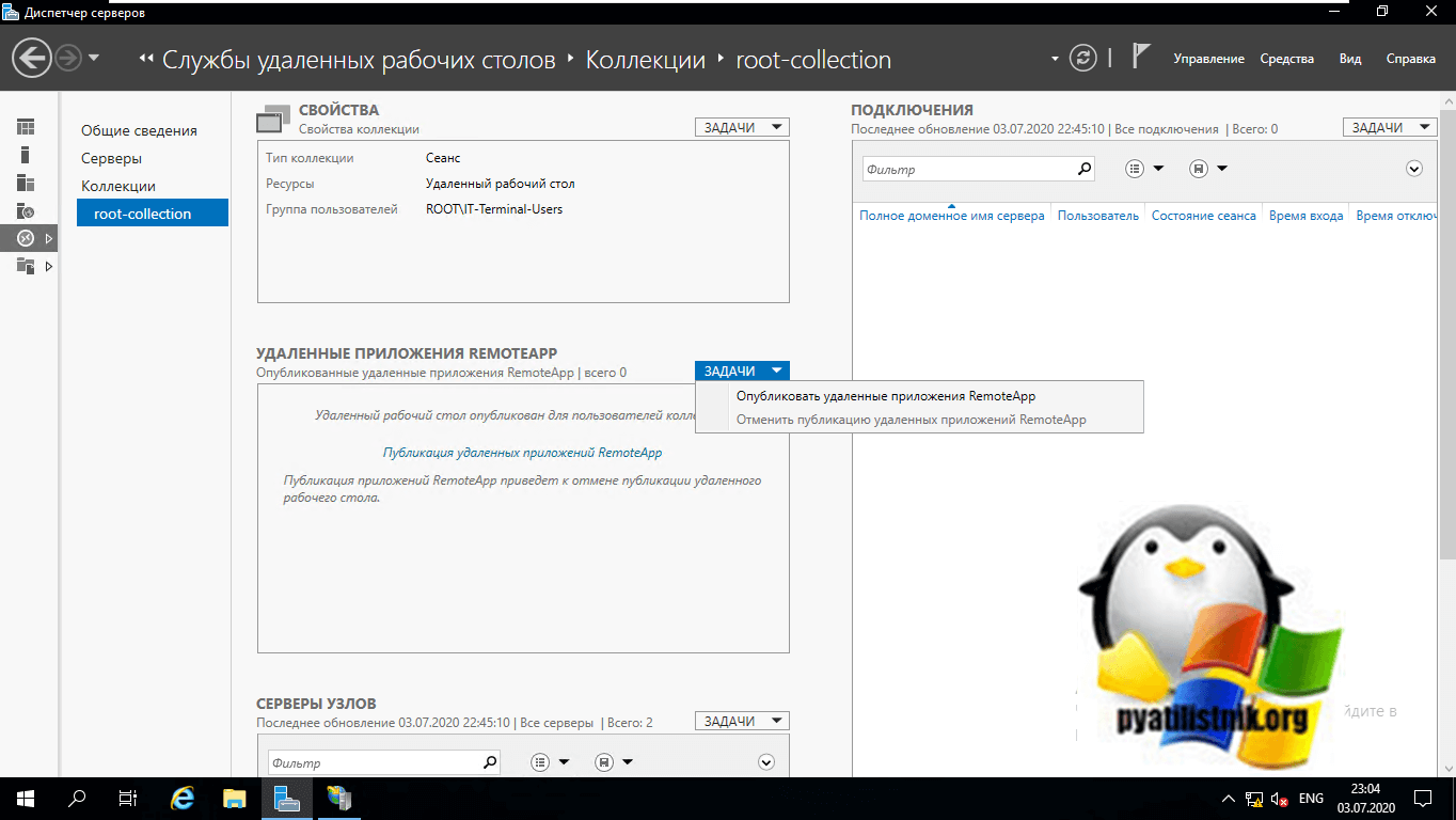 Теперь нам нужно получить значение loadbalanceinfo из свойств вашей коллекции, оно будет прописано в реестре брокеров. Для этого выполним публикацию приложения RemoteApp. Переходим в коллекцию службы удаленных рабочих столов и находим раздел «Удаленные приложения RemoteApp». Нажимаем на задачи и произведем публикацию удаленного приложения RemoteApp.