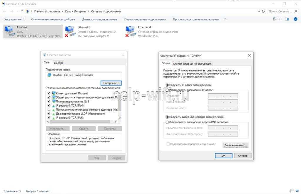 Для настройки DHCP сервера в операционной системе Windows нужно зайти в “Центр управления сетями и общим доступом” и выбрать пункт “Изменение параметров адаптера”. В открывшемся окне нужно найти сетевую карту и в контекстном меню выбрать пункт “Свойства”, в новом окне найти пункт “IP версии 4” и нажать на кнопку “Свойства”. В открывшемся окне можно увидеть, что активны настройки получения адреса автоматически.