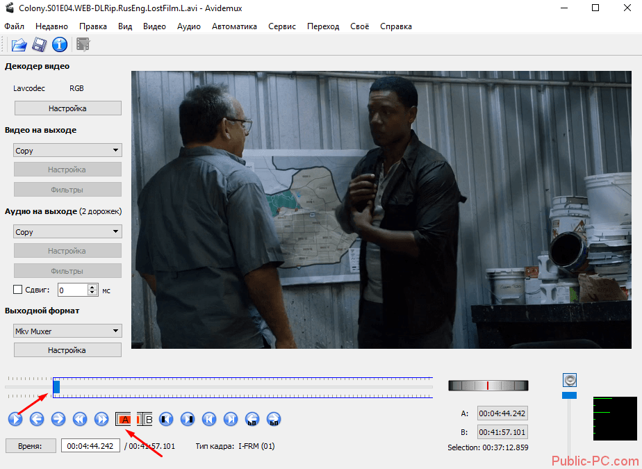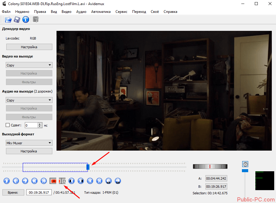 Обрезать видео в Avidemux предельно легко. Выставляем временной ползунок на том участке ролика, с которого нужно начать обрезку. Дальше нажимаем на иконку «A». Мы поставили маркер на том времени, с которого нужно обрезать видео.