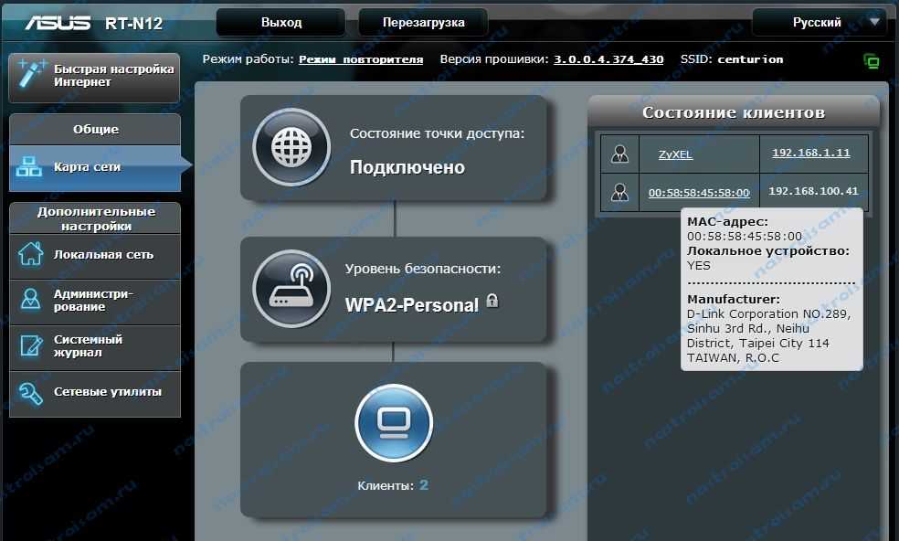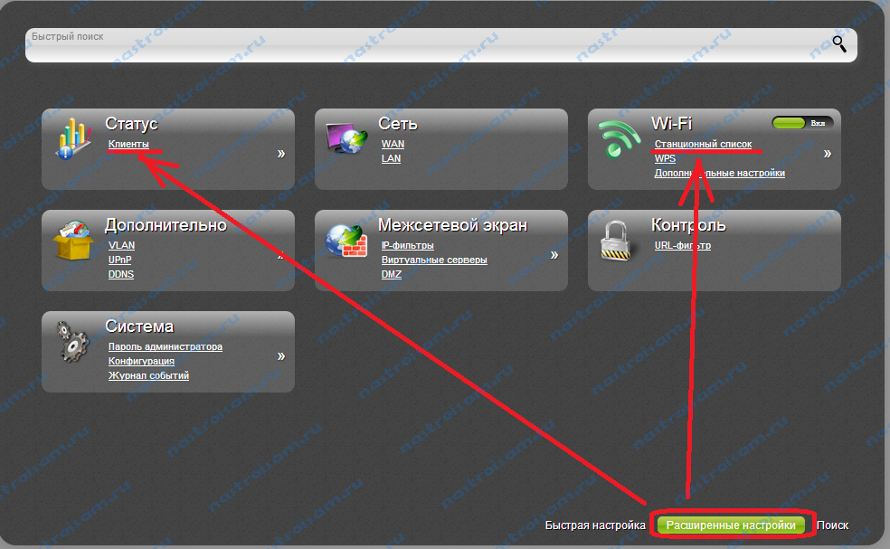 Практически на всех современных моделях этого производителя так же используется единый стиль веб-интерфейса. Узнать кто подключен к сети WiFi роутера можно в Расширенных настройках в разделе «Статус» > «Клиенты или Wi-Fi» > «Станционный список». Последний вариант предпочтительней, так как можно сразу отключить злоумышленника, поставив галочку рядом с его MAC-адресом и нажав кнопку «Разъединить».