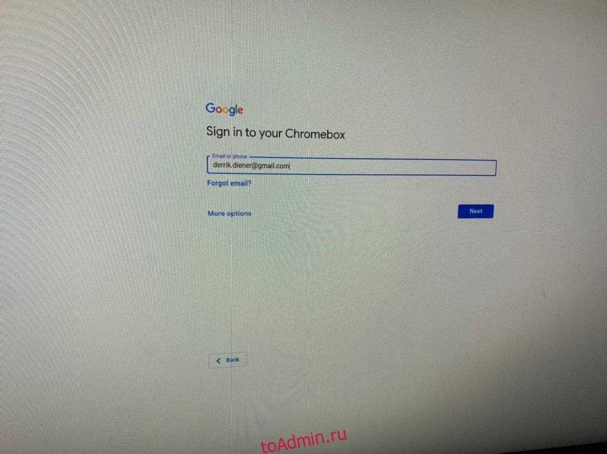 После того, как Chromium OS завершит проверку обновлений программного обеспечения, вам будет предложено войти в свою учетную запись Google. Введите свой адрес Gmail и связанный с ним пароль для входа.