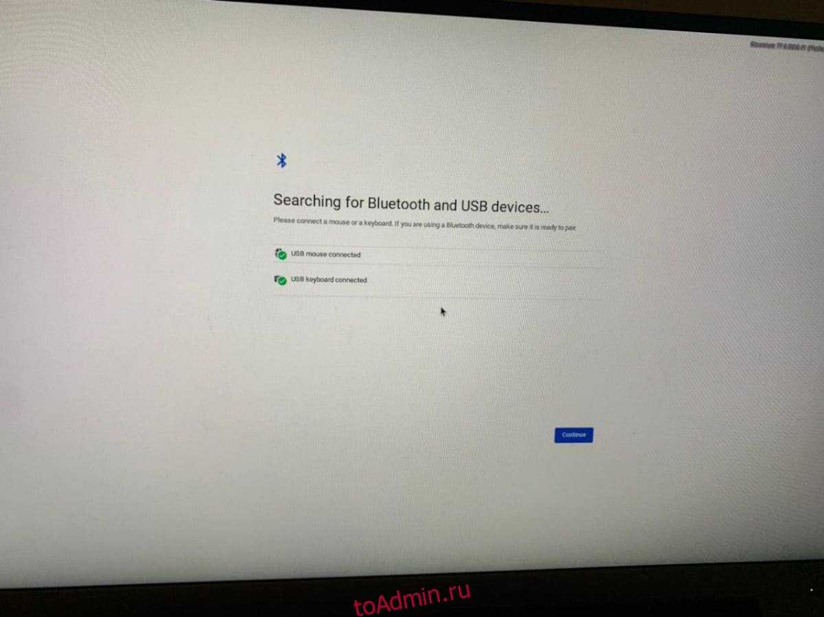 После подключения блока питания, клавиатуры и мыши подключите шнур HDMI к порту HDMI Pi и подключите его к монитору компьютера или телевизору. Когда HDMI подключен, вы должны увидеть окно с надписью «Поиск устройств Bluetooth и USB…». Нажмите кнопку «Продолжить» внизу, чтобы перейти к следующей странице.