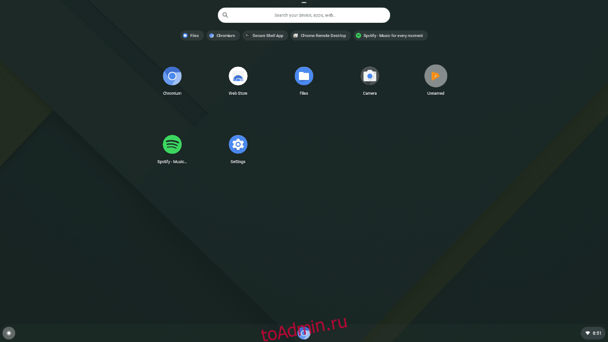 Когда вы успешно введете свой адрес Gmail и пароль в поле входа, Chromium OS запустится и представит вам рабочий стол. Отсюда нажмите значок «Chromium», чтобы просматривать веб-страницы, или значок поиска слева, чтобы открыть другие приложения Chrome на Pi.