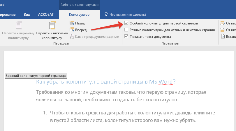 - в открывшемся меню следует установить галочку около опции «Особый колонтитул для первой страницы» и изменить на нужный вам вариант.