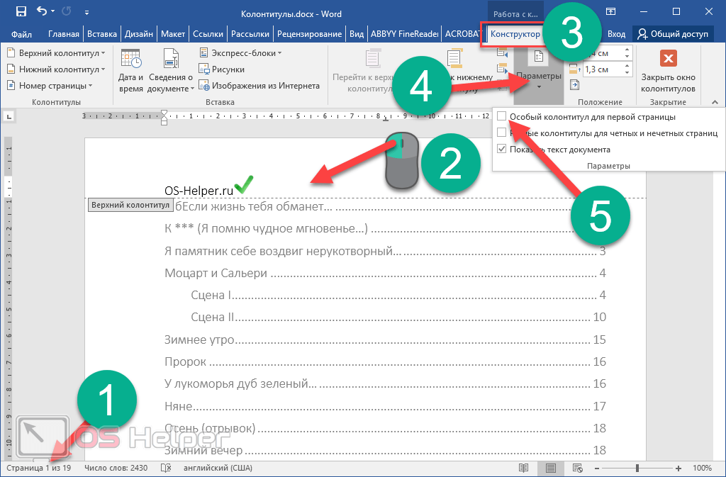 Если Вы часто сталкиваетесь с оформлением брошюр или просто используете двухстороннюю печать, Вам может пригодиться функция изменения каждого второго колонтитула. С ее помощью можно как полностью удалять колонтитулы четных или нечетных страниц, так и вносить в них определенные изменения, например, выровнять номер страницы по наружному углу. Получить доступ к функции можно, воспользовавшись таким алгоритмом: